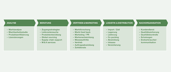 Man muss seinen Zielmarkt verstehen um Erfolg zu haben. Nur mit den richtigen Produkten, solche die der lokale Verbraucher sucht und/oder gewohnt ist, wird dies gelingen. Deshalb stellen wir auch eine einzigartig vollständige Dienstleistungspalette entlang der gesamten Wertschöpfungskette zur Verfügung. Nur mit dem Angebot alle Bereiche zu beeinflussen ergibt sich die Chance auf maximalen Erfolg.
